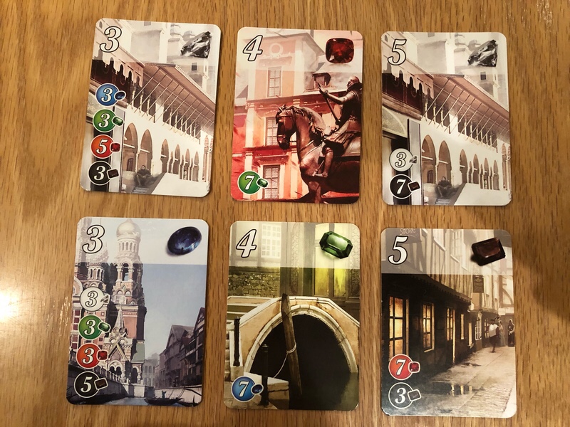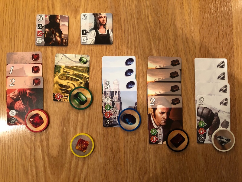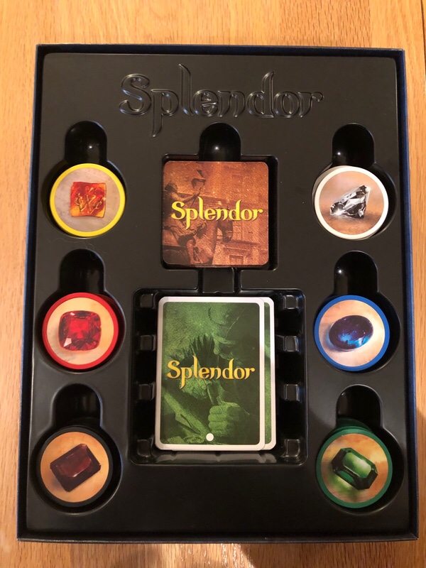 There is a light engine building element here, as each card will upgrade your buying power by permanently adding one gem to a color. Some cards will also have point values, as do the noble tiles. Noble tiles are earned by collecting cards of specific colors. When one player hits 15 points, the round is finished out, and the player with the most points wins.