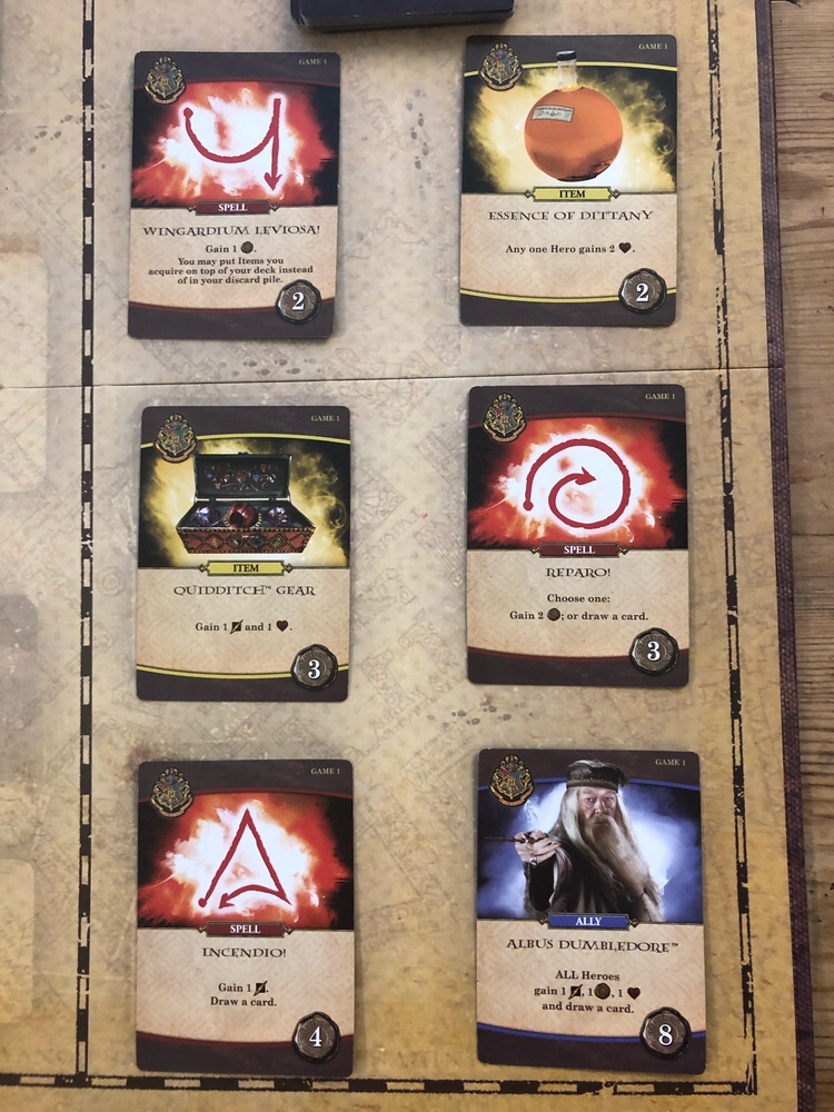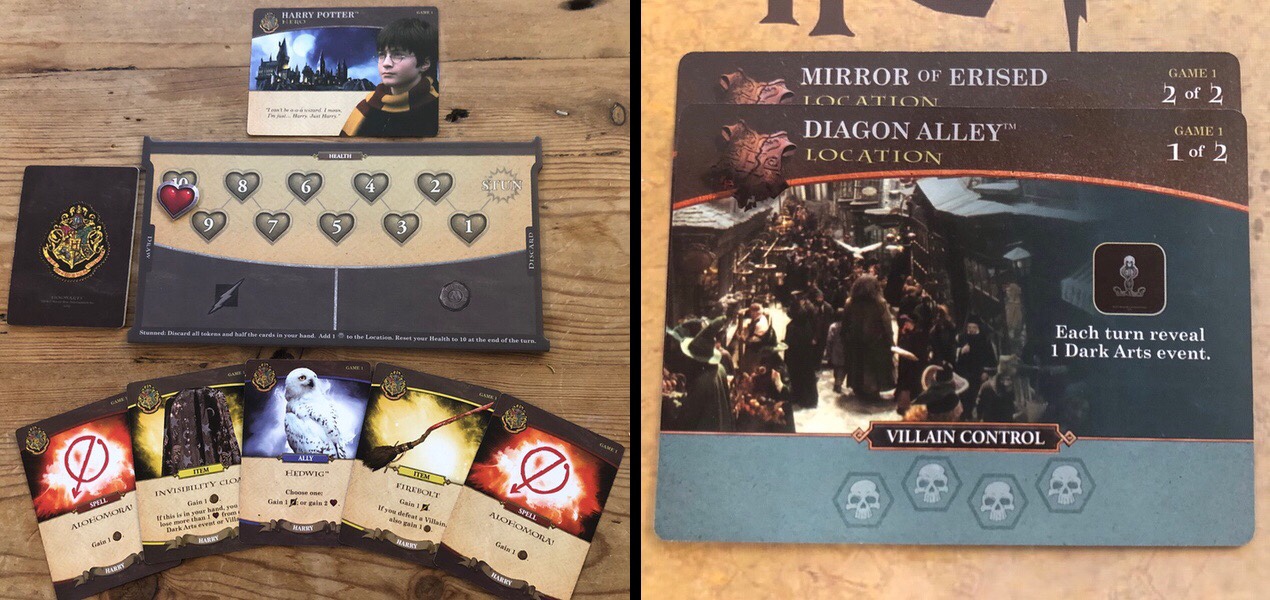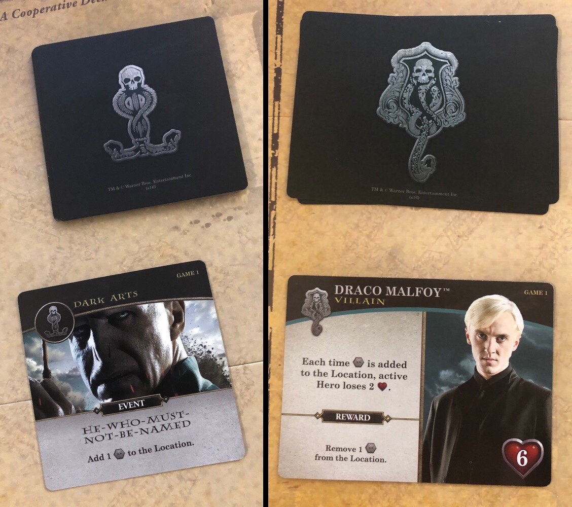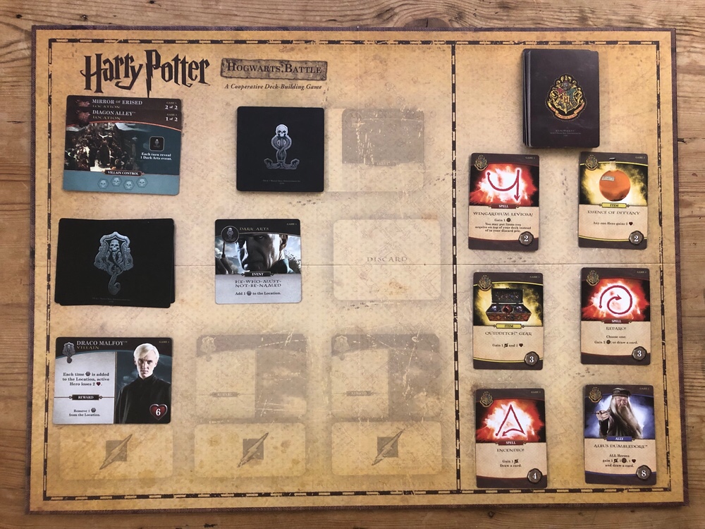 Hogwarts Battle is a standard deck building game, albeit a cooperative one- a step outside the norm. The crux of the game revolves around location cards. These cards each possess a number of spaces, which through the course of the game are filled with Deatheaters. These will come into play in a variety of ways, but primarily via Villains and Dark Arts cards. When a location is filled, players have until the end of that turn to remove at least one Deatheater- otherwise the location is lost. You will work together with your fellow players to defeat all villains before your last location is lost to Lord Voldemort’s forces. During each turn your remaining cards will allow you to gain and use three effective resources: Health; Attack, which is assigned to villains in order to defeat them; and Influence, which acts as a currency for purchasing new cards to add to your deck. In addition to this, cards will often possess special abilities that will help in your battle with the Deatheaters considerably.
