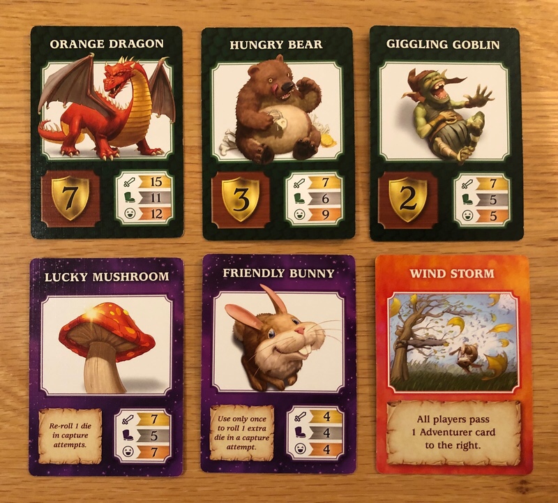 Dragonwood comprises two decks of cards, and six dice. The ‘Dragonwood’ deck is made up of three types of cards: Creatures, which you will capture in order to earn victory points; Enhancements, which will provide you with special abilities; and Events, which when revealed shake up the status quo of the game. The Adventurer deck looks similar to a normal deck of playing cards, with cards of five characters (suits), numbered 1 to 12. You’ll effectively be capturing creatures and enhancements with poker hands: Strike (a straight), Stomp (x of a kind), or Scream (a flush). Upon playing a number of cards, players will be able to roll that same number of dice against a defense number on the creature cards corresponding to the method of attack. Defeated creatures have an associated point value for end of game scoring.