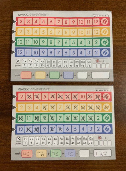 Qwixx was arguably the first big modern roll-and-write, and the formula it presents is fairly straight forward. On your sheet you’ll see four rows of ascending/descending numbers in four different colors, and your goal is to fill up some of those numbers faster than your opponents. In the original game you’d accomplish this with a combination of six multi-colored dice, but in the sequel you’ll be using cards numbered from 2 to 12 to achieve the same results. The sneaky catch here is that before you utilize any cards, you will collect them from the field- which means your opponent will likely not have access to that card at all. There’s a bit of a stop gap, as before each turn all players have access to the number on the back of the top card of the deck; but you’ll find this won’t be as helpful as you might like.